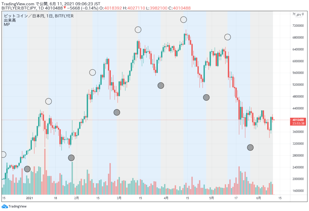 お金 / 投資ビットコインをムーンフェーズ(新月と満月の周期)で購入してみる 先日、ムーンフェーズというものを知りました。 新月と満月のタイミングで相場が動くというのです。 ビットコインの日足チャートにムーンフェーズを表示してみました。 白丸が新月で黒丸が満月。 実際にチャートを見て... 2021.05.29お金 / 投資